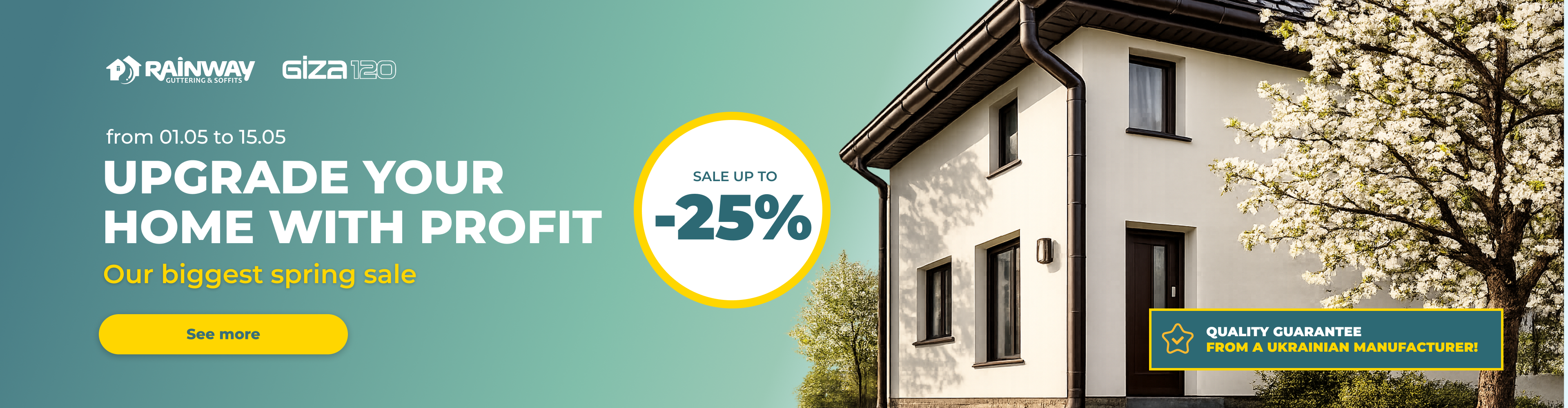 - 25% off Rainway and Giza gutter systems (in red, brick, green, and gray);